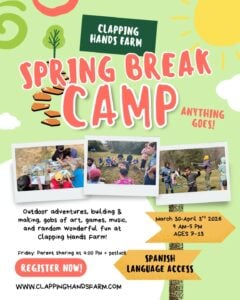 Join Clapping Hands Farm for their Anything Goes Spring Break Camp hosted on Mon, Mar 30-Fri, Apr 3, 9am-5pm. This week-long camp is a glorious sampler of lots of Clapping Hands’ favorite things: outdoor adventures, building and making, gobs of art, games, music, and a good measure of random, crazy, wonderful fun. On Friday at 4pm, there is a parent sharing period, followed by a potluck.