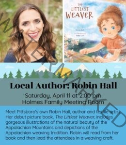 Join the Chatham Community Library for an Author Event with Robin Hall on Sat, Apr 11, 2pm-3pm. Meet Pittsboro’s own Robin Hall, author and textile artist. Her debut picture book, The Littlest Weaver, features stunning illustrations that capture the natural beauty of the Appalachian Mountains and depict the rich Appalachian weaving tradition. During this event, Robin will read from her book and then lead the attendees in a weaving craft.