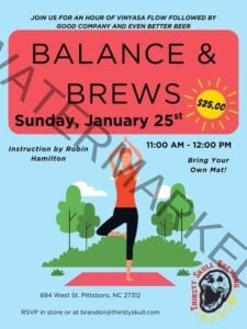 Come to Thirsty Skull Brewing – Pittsboro for Balance and Brews on Sun, Jan 25, 11am-12pm. Enjoy their beautiful Biergarten with a relaxing Vinyasa yoga workout. The cost is $20 per participant and includes a beer when you’re done. Make sure to bring your own mat! Instruction by Robin Hamilton. RSVP by emailing [email protected].