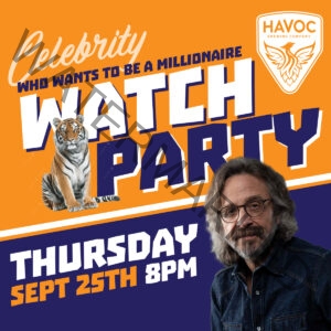 Join Carolina Tiger Rescue for a Watch Party: Celebrity Who Wants to Be a Millionaire? on Thu, Sep 25, 8pm-9pm at Havoc Brewing Company. Comedian and Apple TV+ Stick actor Marc Maron has chosen Carolina Tiger Rescue as his charity of choice in the upcoming season finale episode of Celebrity Who Wants to Be a Millionaire with Sarah Silverman, hosted by Jimmy Kimmel! Bus Stop Melts food truck will be on site from 5pm-9pm.