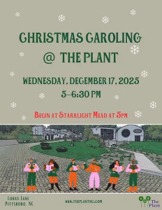 Come get in the Holiday Spirit with Christmas Caroling at The Plant on Wed, Dec 17, 5pm-6:30pm. Bring your friends and family and help spread joy around their campus! They will be starting at 5pm at Starrlight Mead.