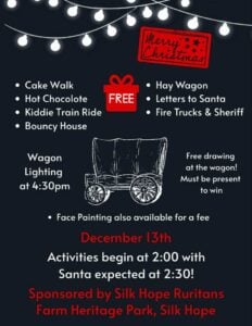 Join Silk Hope Farm Heritage Park for a Christmas Celebration on Sat, Dec 13, 2pm-5pm. Santa will arrive at 2:30pm on the Farm Heritage Park grounds, accompanied by a special guest! Bundle up the kiddos and come on out to have your picture taken with Old Kriss Kringle. There will be lots of other fun for the whole family, including kiddie train rides, hot chocolate, a bouncy house, letters to Santa, face painting (fee), and a cake walk. Be sure to stick around for the lighting of the wagon at 4:30pm. A free special drawing will take place at the wagon (must be present to win).