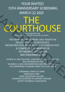 Whether you’re a longtime resident or new to Pittsboro and the Chatham County community, this event provides a unique opportunity to connect with local history and celebrate the courthouse as a symbol of resilience and renewal. Admission is FREE, and donations will be accepted to benefit the Chatham County Historical Association.