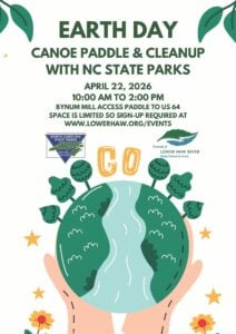 Join Friends of the Lower Haw and NC State Parks for an Earth Day Canoe Paddle and Clean Up on Wed, Apr 22, 10am-2pm at the Lower Haw River State Natural Area. Paddle the Haw in a tandem canoe while cleaning up trash in the river along the way. After a short introduction, the paddle trip will launch at Bynum Mill Access and take out about 3.4 miles downstream at the US 64 Haw River Canoe Access, with a shuttle ride back to Bynum Mill Access.
