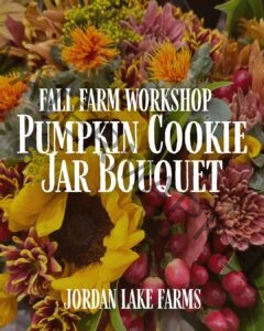 This class takes place at the Jordan Lake Farms Pavilion. The cost is $80 per arrangement participant and $20 for participant guest/floral helpers. The workshop includes a pumpkin-shaped cookie jar that will come in handy for the fall season, a bucket full of flowers, fall decorations, step-by-step instructions, tools, and a glass of wine. You’re welcome to bring outside food to enjoy, but there will also be mini charcuterie boards for purchase with NC products such as cheeses, salamis, cheese straws, cookies, peanuts, and much more. Participants must be at least 14 years old. Those 14-17-year-olds need to be accompanied by an adult.