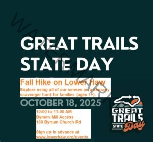 Join Friends of the Lower Haw River State Natural Area for a Fall Hike on the Lower Haw on Sat, Oct 18, 10am-11am at the Bynum Mills Access, in celebration of Great Trails State Day. Families ages 7+ are welcome to explore using all five senses with a special sensory scavenger hunt. Participants will enjoy taking in all that the season brings, even beyond the beautiful colors! Your guide will be Friends of Lower Haw board member and environmental educator Emily Behr. Arrive by 10am; the hike will begin at 10:15am. Bring a water bottle and wear comfortable shoes and clothing. Children must be accompanied by an adult at all times. This family-friendly event is free and open to the public. Please register in advance using this form.