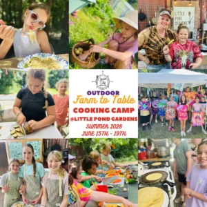 Join the Circle City chef for a week of outdoor culinary skill-building during this Farm to Table Outdoor Cooking Camp: Summer 2026, hosted Mon, Jun 15-Fri, Jun 19, 8:45am-3pm! Campers, ages 7+, will start the day tending and harvesting in the beautiful Little Pond Gardens, a privately owned garden space with an outdoor kitchen and acres of trails, a creek, and nature to explore.