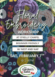 Join For Garden’s Sake for a Floral Embroidery Workshop on Sat, Feb 7, 2pm-4pm at O’Kelly Chapel. This beginner-friendly floral embroidery class will focus on fabric embellishment. Participants will embroider texture onto fabric (specifically Rifle Paper Co. cotton) and learn many basic embroidery stitches in the process. Class will begin with a tutorial on the basics of embroidery, a demo of basic stitches, and then time to stitch. Participants will also receive information on how to further their interest in embroidery and create their own designs. The project will not be fully completed during class time, but participants will be sent home with all the knowledge and materials needed to finish the embroidery at home.