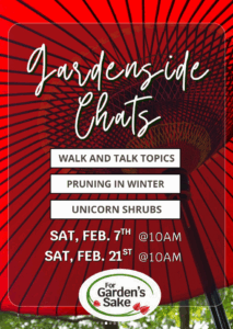 Join For Garden’s Sake for a Gardenside Chat – Unicorn Shrubs on Sat, Feb 21, 10am-10:30am. FGS will explore evergreen and flowering shrubs that make a standout addition to any garden. Shannon, their Tree & Shrub Department Lead, will highlight “unicorn” shrubs—unique varieties known for their standout features, seasonal interest, and beauty—along with the care they need to thrive. There will also be time for questions and answers, so you can get personalized advice for your landscape.