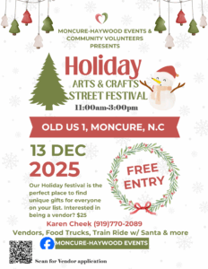 It is the most wonderful time of the year! Come to Moncure for an incredible transformation of Old US 1 into a holiday wonderland at the Holiday Arts and Crafts Street Fair on Sat, Dec 13, 11am-3pm. Stroll Old U S 1 and experience the magical spirit with pop-up vendors such as Seven Springs Winery, food, live music, a Polar Express Train, shopping, and more. Are you known for your baked goods, homemade goodies, crafts, and retail items? Would you like to market and expand your organization/business reach to the community? They have a booth reserved just for you! They’ve also added the Holiday Car Show! Showcase trophies will be presented to the winners. Early Bird Car Show entry cost is only $10. Entries submitted on the day of the event will be $15.