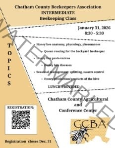 Join the Chatham County Beekeepers Association for an in-person, one-day Intermediate Beekeeper Course on Sat, Jan 31, 8am-5:30pm at the Chatham County Agriculture & Conference Center (CCACC). The primary audience for the school is beekeepers with at least one year of beekeeping experience. This course is designed to help local beekeepers advance their knowledge and to increase the number of skilled beekeepers in the region. The course will be taught by a group of beekeepers who are not only subject matter experts but also have several years of practical knowledge and experience on the topics presented. At the conclusion of this one-day class, participants will have received education regarding relevant beekeeping topics that will enable them to be better beekeepers and prepare them for advanced-level testing.
