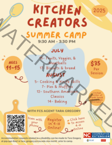 Each session varies with content and recipes, so youth attending multiple sessions will have the opportunity to try out new recipes. Please note: No arrivals will be accepted before 9:20am. Campers must be dropped off and picked up on time – a fee will be assessed for late pick-ups. The cost is $35 per session. A limited number of need-based scholarships are available – please inquire with the Cooperative Extension/4-H office for more information on how to apply. Any dietary restrictions should be relayed to FCS Agent Tara Gregory at [email protected] at least one month prior to ensure accommodations. Accommodation requests can be made to Tara Gregory up to one week before the workshop. Contact her at 919-542-8247 or [email protected].