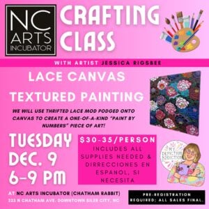 Join Jessica Rigsbee of My Depiction Addiction for a Lace Canvas Textured Painting Class on Tue, Dec 9, 6pm-9pm at the NC Arts Incubator. Get ready for a night of texture, sparkle, and creative magic as you transform thrifted lace into one-of-a-kind textured paintings! You’ll start by Mod Podging lace directly onto the canvas to build a raised paint-by-numbers-style pattern (it’s wildly satisfying). Then it’s paint time — bright colors, bold choices, metallic moments — go full maximalist or soft + dreamy, whatever your vibe is! No art experience required — just come ready to get messy, play with color, and leave with a gorgeous finished piece you’ll actually want to hang on your wall.