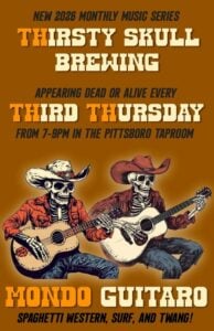 Join Thirsty Skull Brewing – Pittsboro for Live Music with Mondo Guitaro, hosted every third Thursday,7pm-9pm. Come hang out and listen to the awesome sound of Mondo Guitaro. “Lonesome Tones for High Plains Drifters”: Mondo Guitaro performs spaghetti western, surf, and 1960s-style instrumentals arranged for two guitars. You won’t want to miss this!