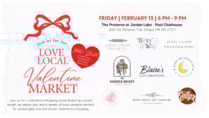 Visit the Pool Clubhouse at The Preserve at Jordan Lake Golf Club for a Local Love Valentine’s Market on Fri, Feb 13, 6pm-9pm. This shopping event will feature a photo booth and fun photo ops, as well as a variety of local vendors—perfect for unique gifts and last-minute Valentine’s shopping. Vendors include: