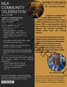 Join Mitchell Chapel AME Zion Church, Chatham Community NAACP, and The Community Remembrance Coalition – Chatham (CRC-C) for an MLK Community Celebration on Mon, Jan 19, 12:30pm-2pm. CRC-C and students from Seaforth High School are sponsoring a drive to support CORA. The Chatham County Sheriff’s Honor Guard will open and close the event. The Woods Charter Chorus will be performing during the program under the direction of Mr. Irons.