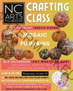 Join Jessica Rigsbee for a Mosaic Pumpkins Arts and Crafts Class on Wed, Oct 29, 6pm-8:30pm at the NC Arts Incubator. You’ll start with a smooth pumpkin base, then spread on colored spackle like frosting before pressing in a mix of shiny gems, tiny charms, mosaic tiles, and other sparkly bits. Go autumn-chic, candy-colored, or totally wild—it’s your pumpkin, your rules! There will be trays of treasures for you to dig through, so your creation is 100% your vibe. No experience needed—just come ready to get a little messy, sip something cozy, and make a pumpkin that’s way too cute to leave on the porch.