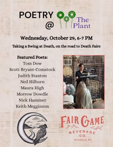 Come out for a special edition of Poetry at The Plant, Taking a Swing at Death on Wed, Oct 29, 6pm-7pm. Join Fair Game Beverage Company in the Wheelhouse as they feature talented local poets who will share their captivating works. This is the perfect chance to unwind, sip on your favorite beverage, and immerse yourself in the beauty of spoken word in a cozy atmosphere. Don’t miss out on this unique experience—come share in the magic of poetry!