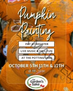 Pay for your pumpkin at the register and paint for free! Free parking is available on-site. See more events at For Garden’s Sake.