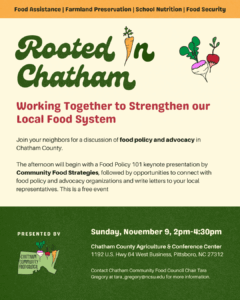 Join the Chatham Community Food Council for Rooted in Chatham: A Food Policy and Advocacy Event on Sun, Nov 9, 2pm-4:30pm at the Chatham County Agriculture & Conference Center (CCACC). The afternoon will begin with a Food Policy 101 keynote presentation by Community Food Strategies and the Carolina Farm Stewardship Association, followed by a Q&A with the presenters and local organizations. The event will conclude with a networking hour with opportunities to connect with local organizations and write letters to your local representatives.