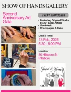Join the Chatham Artists Guild for this Show of Hands Gallery Second Anniversary Opening Reception on Fri, Feb 13, 5:30pm-8pm. A special exhibit celebrating this local gallery’s second “birthday” will run from Fri, Feb 13-Tue, Mar 31, 2026, featuring 2-D and 3-D small artworks newly created by many of Chatham County’s local artists, along with a photograph of their hands creating their piece. The evening will also feature live music and a champagne toast. Plus – it wouldn’t be a birthday party without cake!