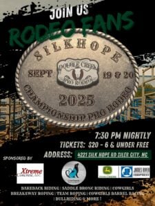 Join Double Creek Pro Rodeo for this year’s Silk Hope Championship Pro Rodeo on Fri, Sep 19 and Sat, Sep 20, 7:30pm-10pm at Silk Hope Farm Heritage Park. Bring out the whole family for bull riding, barrel racing, roping, and more. Tickets are $20 and are only sold at the gate on the day of the rodeo (cash only). Kids ages 6 and under get in for FREE! Gates open at 5:30pm. This rodeo show includes the following events: