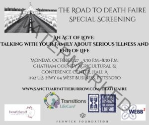 Join heart2heartnc as they kick off this year’s road to Death Faire with a Special Screening: An Act of Love on Mon, Oct 27, 5:30pm-8:30pm at the Chatham County Agriculture & Conference Center. Produced by Transitions LifeCare, “An Act of Love: Talking with Your Family About Serious Illness and End of Life” is a 25-minute documentary that explores the lived experiences of individuals from Black, African American, Hispanic, Latino, and rural communities as they navigate hospice and palliative care. Drawing on the personal stories of people living in the Triangle area, the film sheds light on common misconceptions and the cultural silence that often surrounds end-of-life care in these underserved communities.