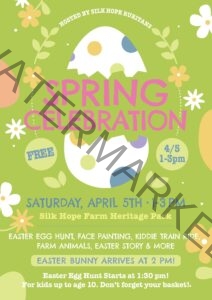 Join Silk Hope Farm Heritage Park for a Spring Celebration on Sat, Apr 5, 1pm-3pm. This family-friendly event includes an Easter egg hunt, face painting, a kiddie train ride, farm animals, cookie decorating, and more. The egg hunt is for kids up to age 10 and begins at 1:30pm – don’t forget to bring your basket! The Easter Bunny will arrive at 2pm.