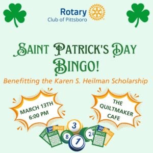 Join the Pittsboro Rotary Club for St. Patrick’s Day Bingo at The Quiltmaker Cafe on Fri, Mar 13, 6pm-9pm. Enjoy a fun night of bingo while supporting the Rotary Club of Pittsboro’s Karen S. Heilman Scholarship fund, which benefits local high school seniors. You may add a dinner ticket at checkout for an additional $20 per person; dinner will be served from 6pm-7pm, with 10 rounds of Bingo beginning at 7pm. You’ll also have the chance to win amazing prizes from some of your favorite Chatham County businesses and organizations.