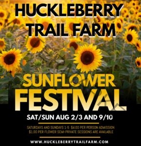 Visit the Huckleberry Trail Farm for Sunflower Fest on Sat, Aug 2 & 9, and Sun, Aug 3 & 10, 1pm-5pm. End the summer with a walk through Huckleberry’s one-acre sunflower field labyrinth. Bring your clippers to pick a big bouquet of flowers ($1 per stem). Plus: