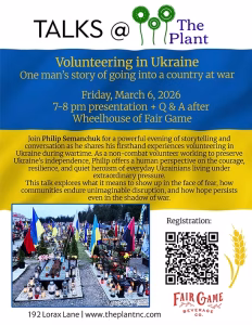 Join The Plant for Talks at The Plant: Volunteering in Ukraine on Fri, Mar 6, 7pm-8pm. Philip Semanchuk offers a powerful evening of storytelling and conversation, sharing his firsthand experiences volunteering in Ukraine during wartime. As a non-combat volunteer working to preserve Ukraine’s independence, Philip offers a human perspective on the courage, resilience, and quiet heroism of everyday Ukrainians living under extraordinary pressure.
