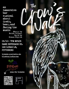 “The Crow’s Walk” is a NEW, two-person immersive bar musical about death, beer, and facing the music. Produced by the Blue Box Theater Company, this play is written to be performed in a bar setting, allowing guests to sip a glass of beer or a Fair Game craft cocktail while taking in this unique show. Tickets are available here. Performances take place on the following dates:
