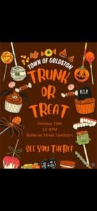 Join the Town of Goldston for a Trunk or Treat event on Sat, Oct 25, 12pm-2pm. Everyone is welcome to participate—bring your decorated trunk and join the fun. There will be prizes for the top 3 trunks! There will also be face painting, inflatables, and lots of candy and fun for the whole family. For more information or to sign up your trunk, contact Lauren at 919.545.4313.