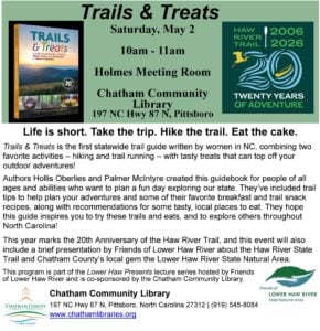 Join Chatham Community Library and Friends of the Lower Haw for Trails and Treats on Sat, May 2, 10am-11am. Trails and Treats is the first statewide trail guide written by women in NC, combining two favorite activities – hiking and trail running – with tasty treats that can top off your outdoor adventures. Authors Hollis Oberlies and Palmer McIntyre created this guidebook for people of all ages and abilities who want to plan a fun day exploring our state. They have selected hikes and runs in four general areas of the state – the mountains, the Triad, the Triangle, and the Charlotte area. Often, there is a trail near your home that will bring joy and gratitude, and a workout if that’s your goal. The authors have included trail tips to help you plan your adventures, as well as recommendations for some tasty local places to eat. Their book also includes some of their favorite breakfast and trail snack recipes that are easy to whip up, tasty, and nourishing. The authors hope this guide inspires you to try these trails and eats, and to explore others throughout North Carolina or wherever you go!