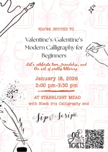 Join Sip & ScriptⓇ at Starrlight Mead for Modern Calligraphy Fun during this Valentine’s/Galentine’s Modern Calligraphy for Beginners workshop on Sun, Jan 18, 2pm-3:30pm. Whether you’re a stationery nerd, DIY Bride-to-be, or just a crafty individual, you’ll be introduced to modern calligraphy with a pointed dip pen and ink in this workshop. The workshop will cover all the basics and prepare you to add those unique lettered details to your snail mail, wedding paper goods, home decor, and more!