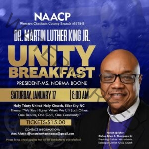 Join Western Chatham County NAACP for a Unity Breakfast in celebration of the life of Dr. Martin Luther King Jr. on Sat, Jan 17, 8am-10am at Holy Trinity United Holy Church in Siler City, NC. The morning will feature keynote speaker Bishop Brian R. Thompson Sr., Presiding Prelate – Mid-Atlantic Episcopal District -AMEZ Church. Tickets are $15 per person. They are asking participants to bring school supplies, which will be distributed to a local school.