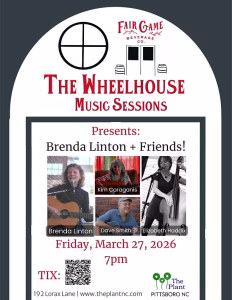 Join The Plant and Fair Game Beverage Company in Pittsboro’s new listening room for Wheelhouse Music Sessions: Brenda Linton + Friends on Fri, Mar 27, 7pm-9pm. Musician and writer Brenda Linton performs her unique blend of song and spoken word, joined on several tunes by guest musicians Kim Caraganis, Elizabeth Haddix, and Dave Smith.