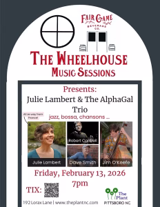Join The Plant and Fair Game Beverage Company in Pittsboro’s new listening room for Wheelhouse Music Sessions: Julie Lambert and The AlphaGal Trio on Fri, Feb 13, 7pm-9pm. Get ready for an intimate evening of groovy jazz, vintage Brazilian, French, and more!