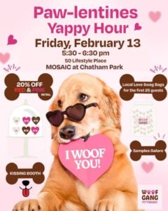 Join Woof Gang Pittsboro in MOSAIC at Chatham Park for a special Paw-lentines Yappy Hour on Fri, Feb 13, 5:30pm-6:30pm. Woof Gang is bringing the love, giving away local love swag bags to the first 25 guests, which will include treats, gifts, and special offers from local businesses. Bring your pup to sample Yappie Hour Beverages for dogs and Bramble dog treats, plus a few more surprises, like the debut of Edie’s very own Paw-Secco blend. There will also be a Dog Kissing Booth (licks welcome). Attend and receive 20% off all pink and red retail in the store – a sweet Valentine’s treat!