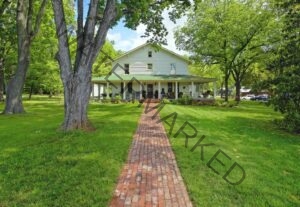Exterior picture showing the front of 458 West Bed & Breakfast. A brick walkway leads to the charming two-story white craftsman home with a light green roof and wrap-around porch surrounded by green grass and large oak trees.