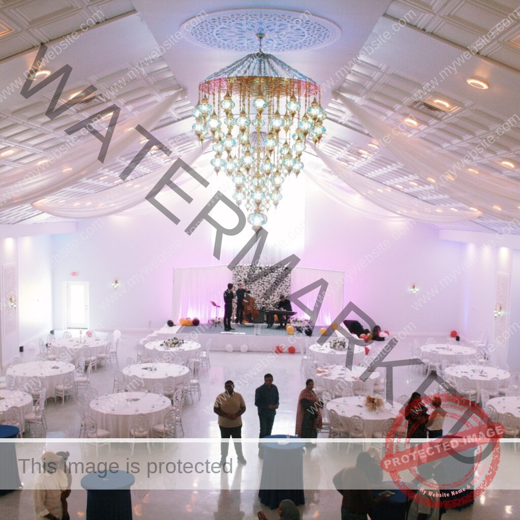 The expansive estate features a 7,000 sq. ft. Grand Ballroom that accommodates over 300 guests. Dazzling Turkish chandeliers, lofted ceilings, and a winding staircase are just a few details that contribute to a sense of classic luxury. The stone paver patio overlooks a picturesque pond and fountain—a delightful setting for courtyard ceremonies. The garden site features a tented reception area set on lush green turf, offering a view of their charming bridge. Guests have the liberty to explore the grounds and discover enchanting gardens, panoramic azure skies, breathtaking sunsets, and lovely celestial nights!